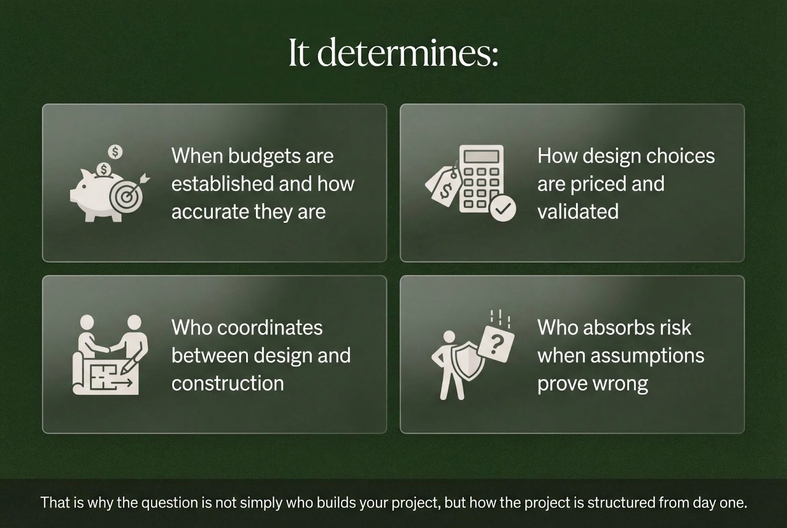 We structure design, budget & contractors before construction begins.